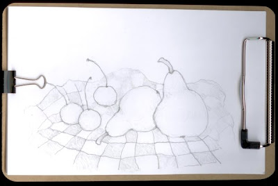and what I think I see on it, the typical striping at the sides, grapes and a pear on either side of a cornucopia (not so sure about the cornucopia; it certainly doesn't look like a vase...or is it?):